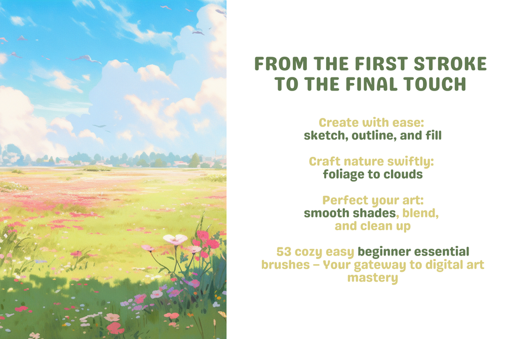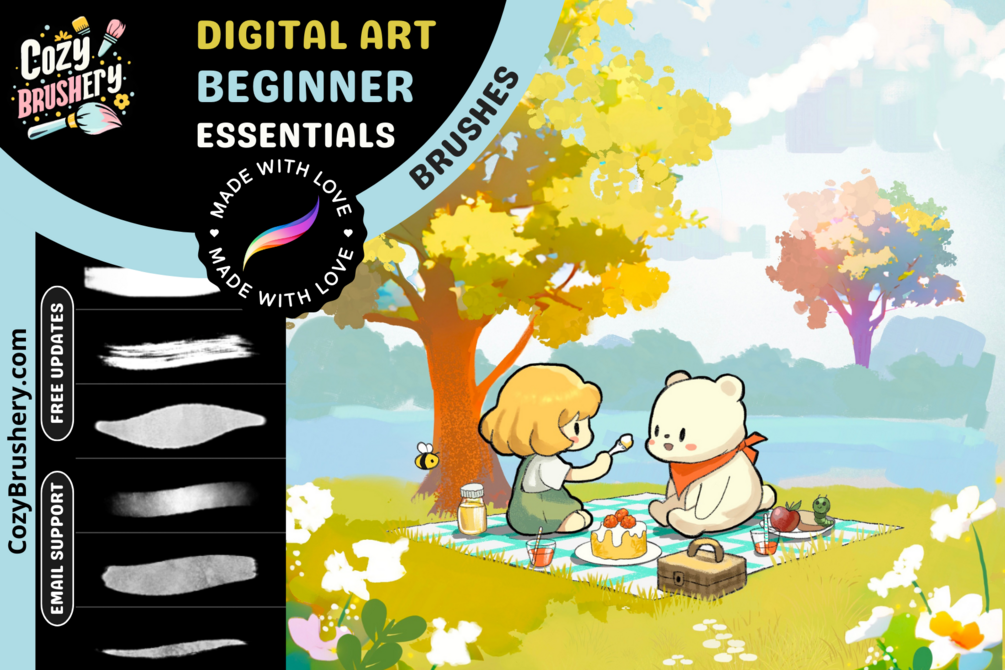 Cozy Essentials Pack – your go-to starter kit for cozy, character-filled art! This beginner-friendly set has all you need for sketches, outlines, fills, and more, giving you the tools to create everything from characters to dreamy backgrounds.