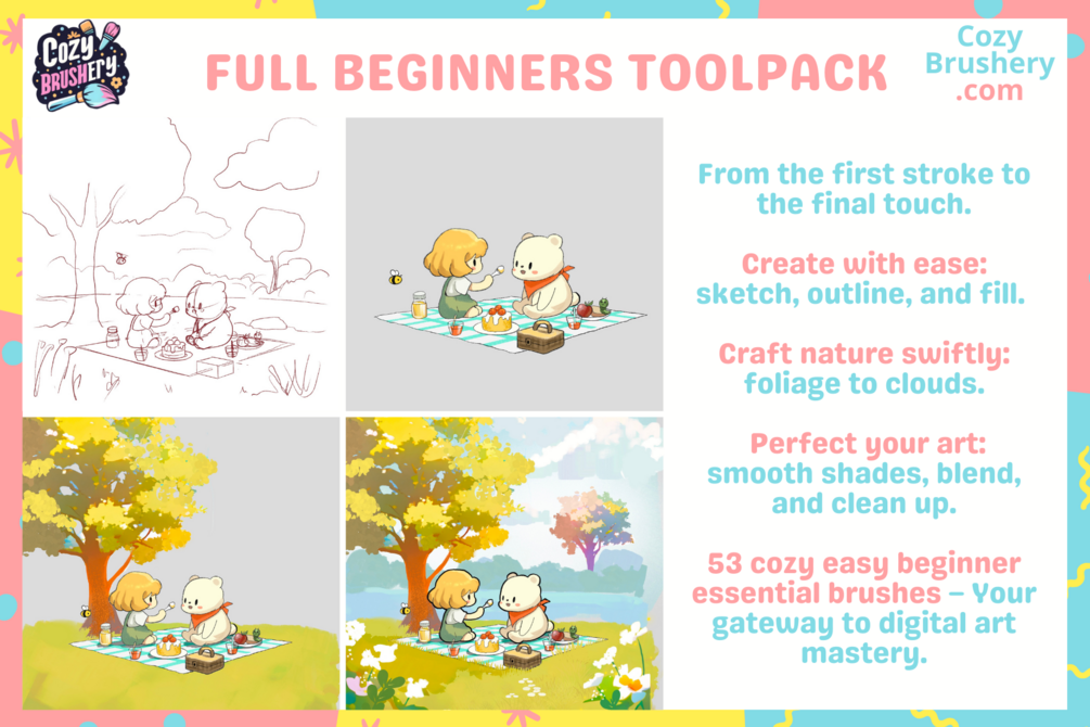 Cozy Essentials Pack – your go-to starter kit for cozy, character-filled art! This beginner-friendly set has all you need for sketches, outlines, fills, and more, giving you the tools to create everything from characters to dreamy backgrounds.