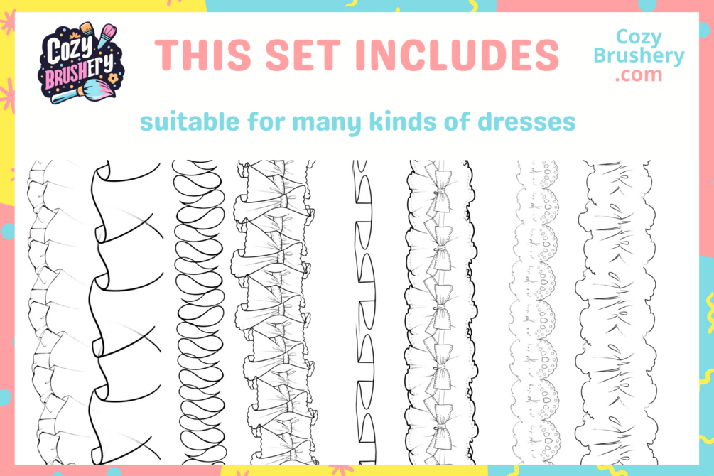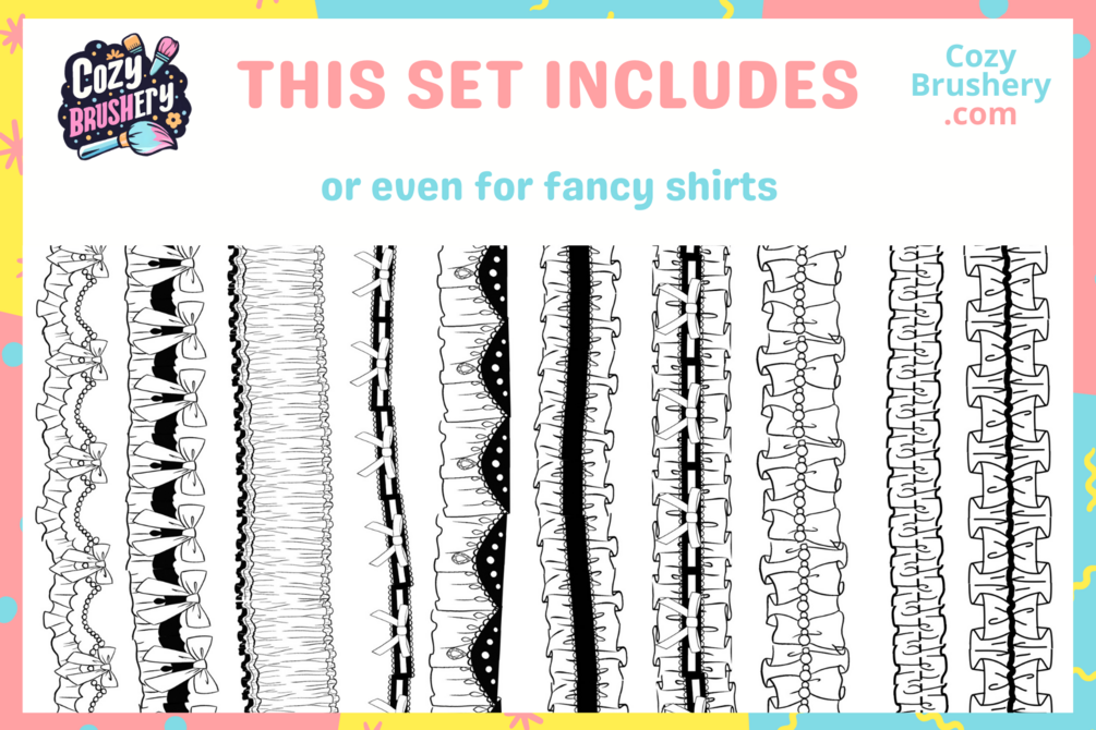 Why settle for plain when you can have pizzazz? These brushes are perfect for designing clothes, crafting whimsical borders, or giving your illustrations that extra “wow.” Whether you're going for dreamy elegance or playful fun, there’s a brush here for every mood and masterpiece.