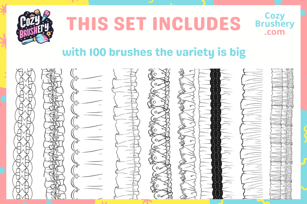 With Ribbon & Lace Carnival, you’ve got 100 brushes packed with endless possibilities. From delicate lace details to bold frilly edges and silky ribbons, this set has everything you need to add charm, texture, and a touch of fancy to your art.