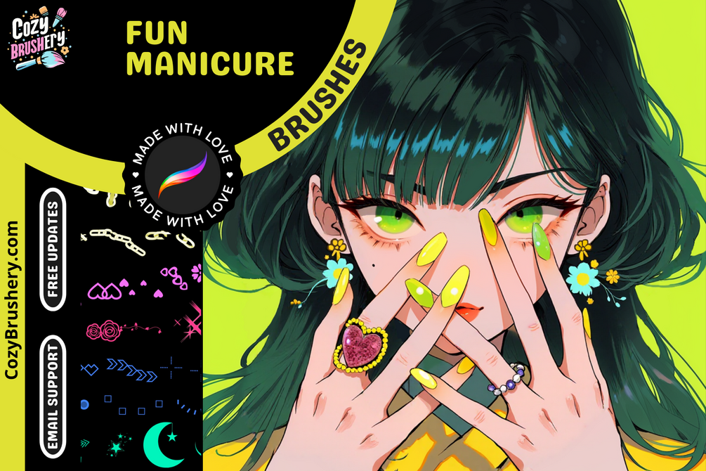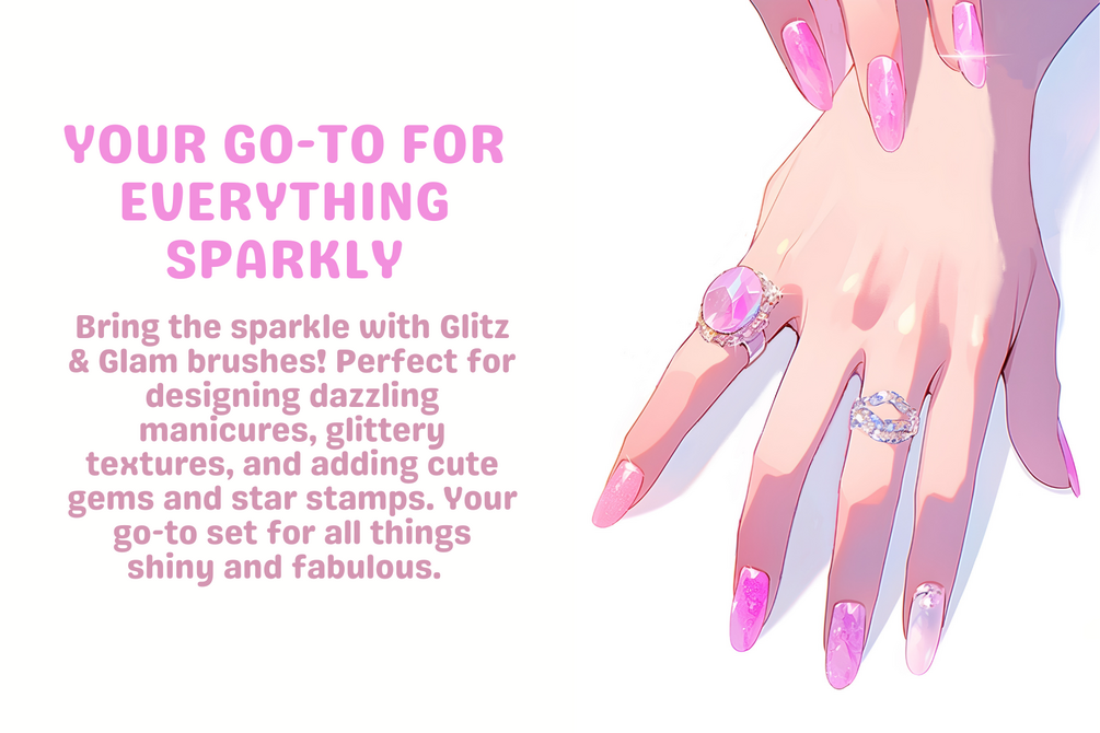 Get ready to add some serious sparkle to your canvas with Glitz & Glam! This brush set is perfect for creating dazzling manicures, dreamy designs, and all things shiny and stunning. Whether you're sketching the perfect nail art or sprinkling some magic into your illustrations, these brushes are here to shine brighter than your fave topcoat.