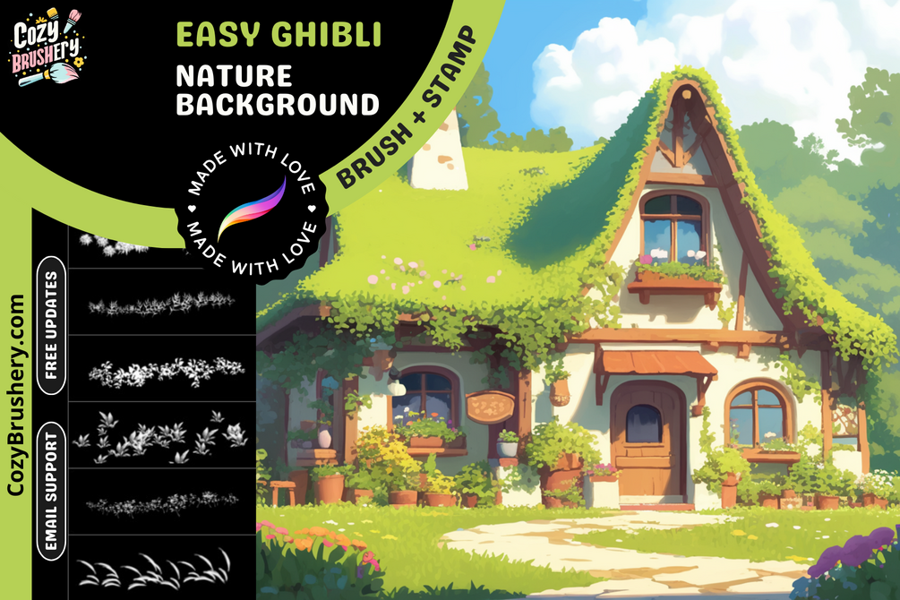 Each brush is tailored to give your artwork that sought-after Ghibli style, whether you're drawing enchanted forests, serene countrysides, or whimsical skies. This pack is a must-have for anime enthusiasts and digital artists looking to expand their creative horizons.
