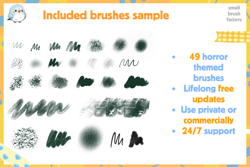 - Horror Effects: Splatter, smear, scratch, and drip brushes to create blood, grime, and other spooky details.