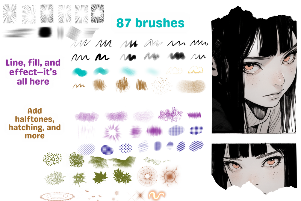 - Halftones and Textures: Create classic manga effects with halftone dots, patterns, and retro textures that feel straight out of the page.