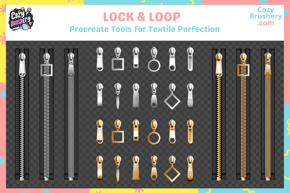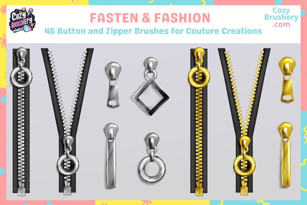 Zip up your digital fashion projects with the Zip and Button Bash pack! This collection features 45 Procreate brushes and stamps, each meticulously crafted to add realistic zippers and buttons to your textile designs. Perfect for fashion illustrators and digital artists, these tools allow for precise detailing and a touch of authenticity in every piece. From clothing sketches to elaborate costumes, these brushes and stamps are versatile for any size project. Plus, you can sell your designs commercially or use them for personal projects.